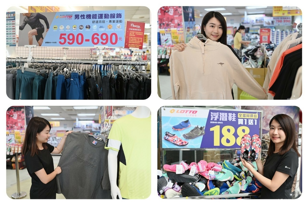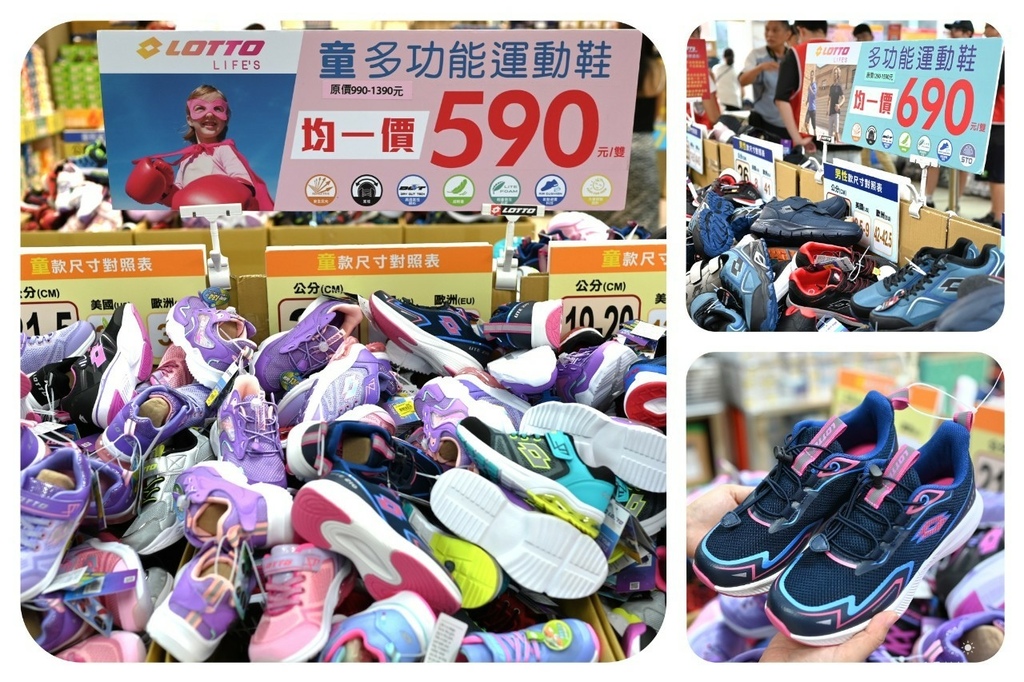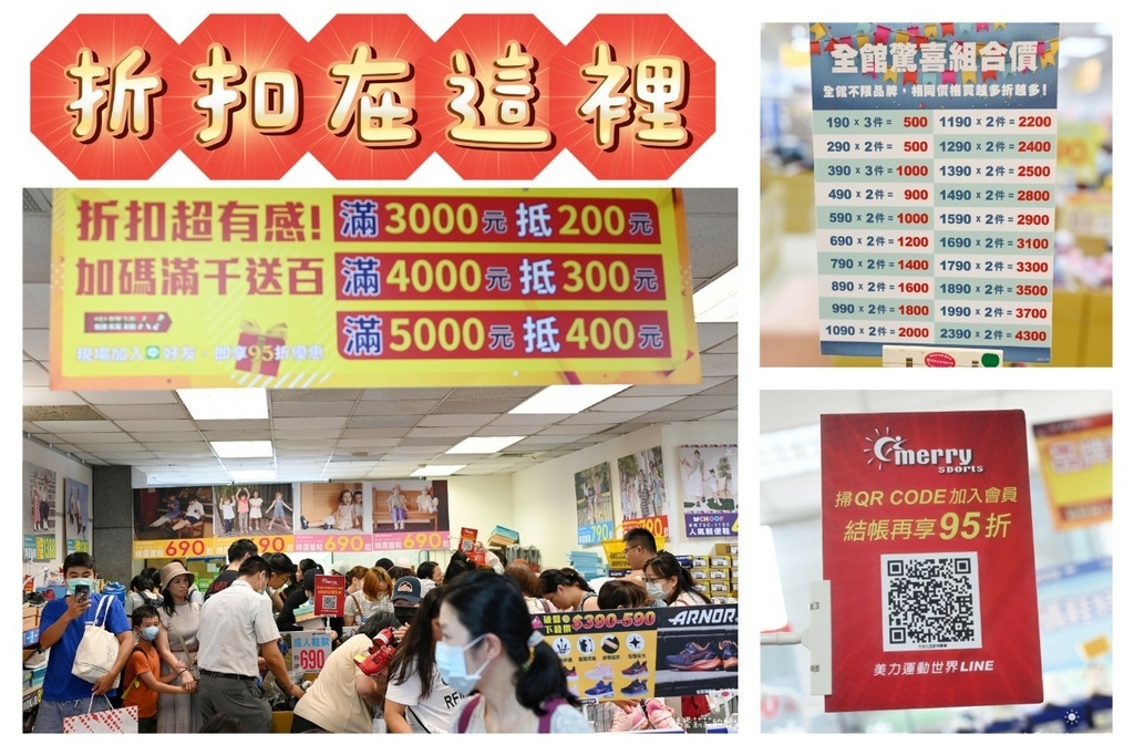 不管是運動用品、還是各式鞋類、童鞋等,除了貨源充足一直補貨外,還提供對折、再對折、再對折的數不清折扣,又還有組合價、好友價、滿千送百